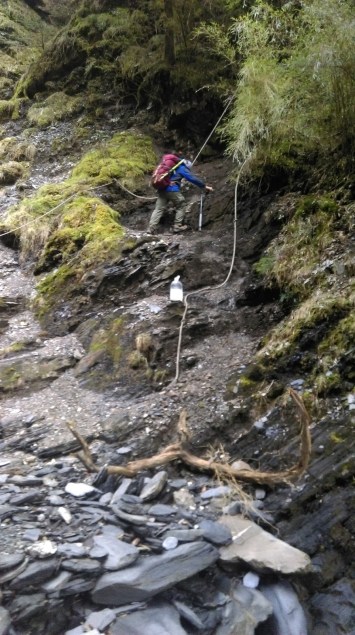 Như đã đề cập, Núi Qilai không có nước dự trữ, nên mấy bạn nam thay nhau vác nước khi đi ngang qua con suối. Đây là hình ảnh lúc qua con suối để đến bờ bên kia. Đường trơn do nước suối, độ dốc là hơn 60 độ. Bạn trong hình không thể vừa đi vừa mang nước, quá nguy hiểm vì phải bám vào dây. Nên chỉ mang được tới đó, bạn đi sau sẽ mang lên tiếp.