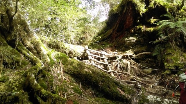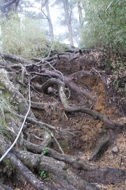 Em nó đây. Nhìn vậy chứ độ dốc của nó là 65 độ đấy. Mang balo nặng 15kg, đu dây như khỉ leo lên mấy cái rể cây này. Nhìn cái rể cây tưởng dễ leo, nhưng nó trơn lắm, đạp lên nó mà không chắc là nó trượt ngã chỏng gọng.