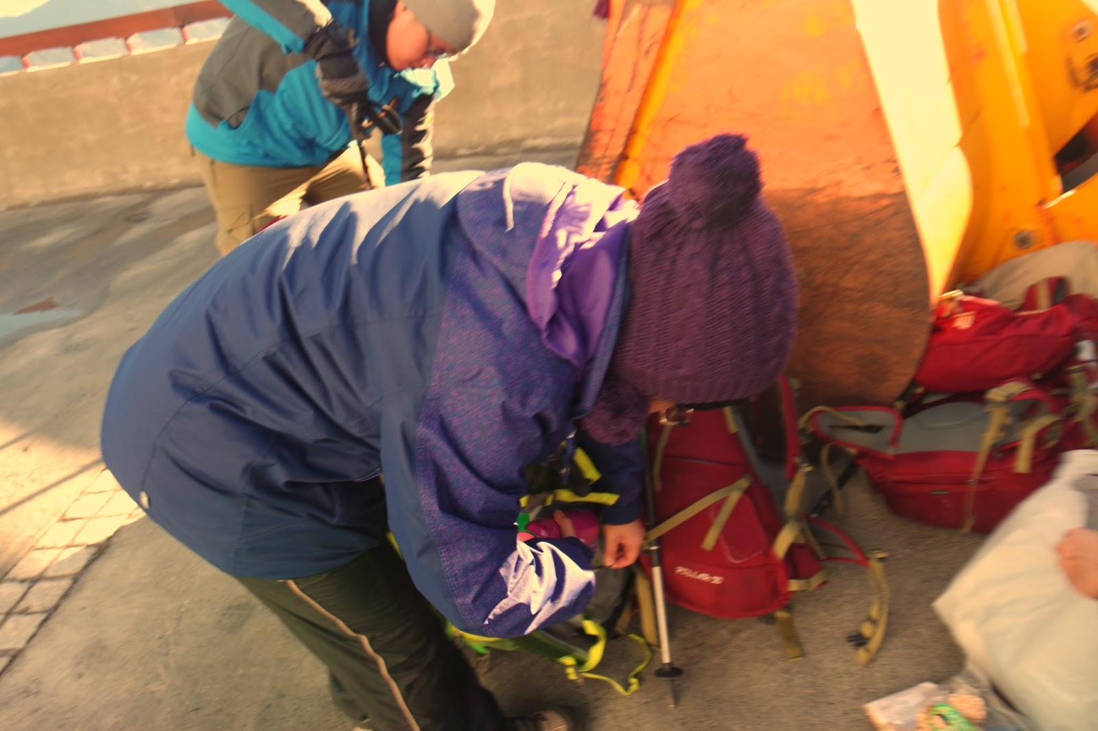 Đang sắp xếp đồ vào vali và đợi đứa bạn để chuẩn bị hành trình di chuyển lên điểm leo.