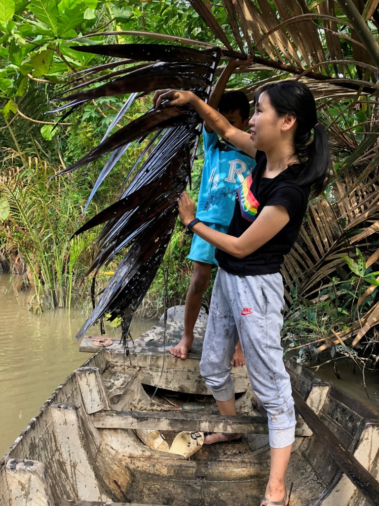 Đi xuồng, lách qua con nước tìm đến những tàu lá dừa chìm sâu dưới nước là sẽ bắt được ốc. Nâng tàu dừa lên, dòm dáo dắt thấy ngon lành thì việc tiếp đến là đứng lắc lắc, ốc sẽ tự tuột cầu tuột theo lá dừa rơi lộp bộp trên ghe… còn rảnh quá thì ngồi bắt từng con, từng con cho có cảm giác rằng mình đang bắt ốc. Cách nào cũng thanh lịch như nhau cả, đừng ngại. ^^