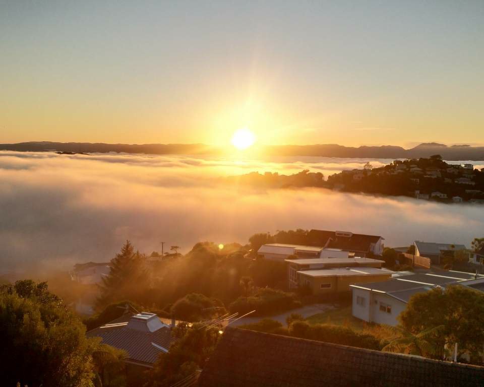 Mình đã chuyển lên đây được hơn 1 năm rồi nhưng đây là lần đầu tiên mình thấy bình minh đẹp như vậy. Cả thành phố bên dưới như bị chìm giữa màn sương. Có lẽ những ngôi nhà dưới mây vẫn tưởng là trời còn đang tối trong khi mặt trời đã ló rạng từ khi nào.