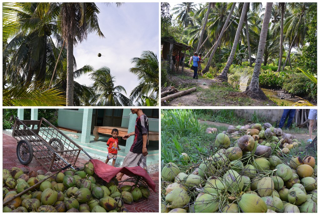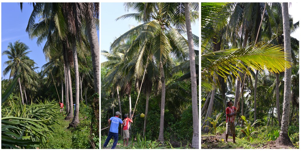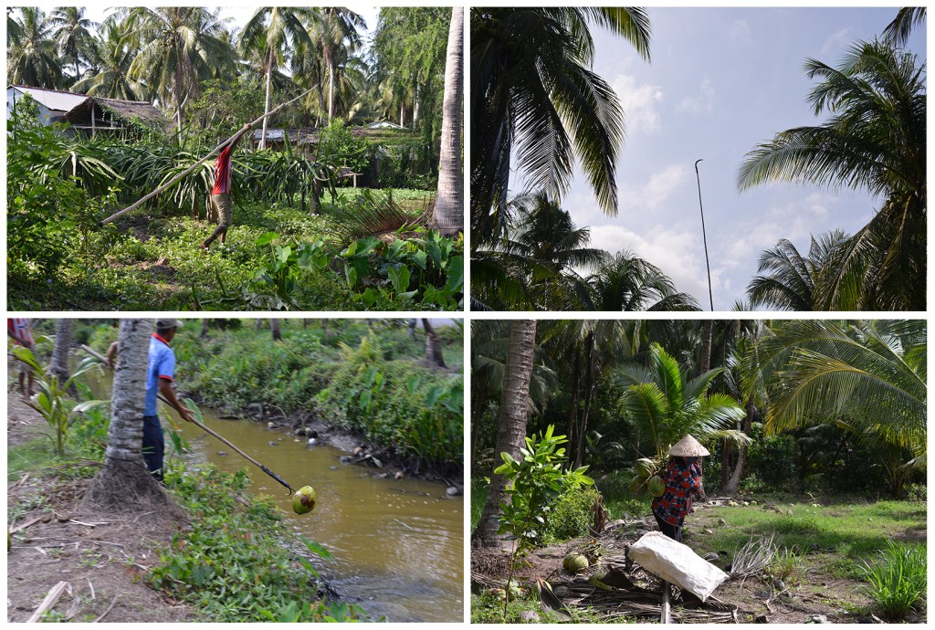 Lúc chụp hình, có vài cảnh bẻ dừa đẹp lắm mà mình không bắt được… do cái máy không thể zoom xa gần, chỉ zoon bằng cách “chạy bằng chân” á, đứng gần thì sợ đao kiếm vô nhãn, dừa vô tình rơi trúng đầu nên toàn đứng chụp từ xa.