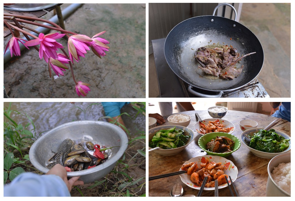 Hoy hoy, nói tiếp về việc nấu ăn ở quê đi, họ chế biến món ăn theo kiểu cây nhà lá vườn, trồng hay bắt được gì thì ăn món đó, hổng cần phải trầm tư giữa chợ suy nghĩ xem mua cái gì. Hôm đó, anh đi bắt ở đâu hông biết, mang về con gà làm món gỏi và món cháo. Món ăn đơn giản mà ngon xỉu lên xỉu xuống hà. Hôm sau, anh qua nhà anh chị vợ, mang về vài con cá lóc, vậy là món cá lóc kho và món canh chua cá được lên mâm. Bông súng là hôm chiều tụi mình lội đìa hái và bắt chem chém á, lúc làm gỏi gà chị bỏ cả bông súng vào luôn , còn dư hôm sau tiếp tục nấu canh chua.