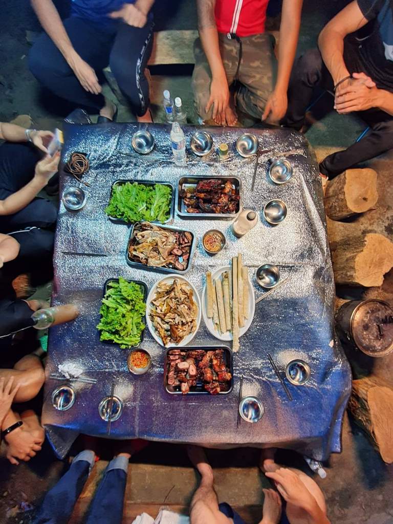 Lúc đầu nhóm lăn tăn không biết nên cắm trại ở trên đỉnh thác hay dưới chân thác, còn cả ý định cắm trại trong hốc hang ở lưng chừng thác nữa cơ. Sau vài giây suy đi tính lại, cả nhóm chốt kèo, cắm trại ở trên đỉnh thác. Và mọi người biết không, có những điều không ngờ nó nằm ở phút cuối á. Sau bữa cơm tối thịnh soạn gồm thịt gà, bò, heo, canh cá suối nấu hoa nghệ rừng, nhấm nháp ly rượu nếp thơm, ngồi buôn cả tấn dưa lê hơn tiếng mà đồng hồ, mà cây kim giờ mới điểm 21g00 tối.