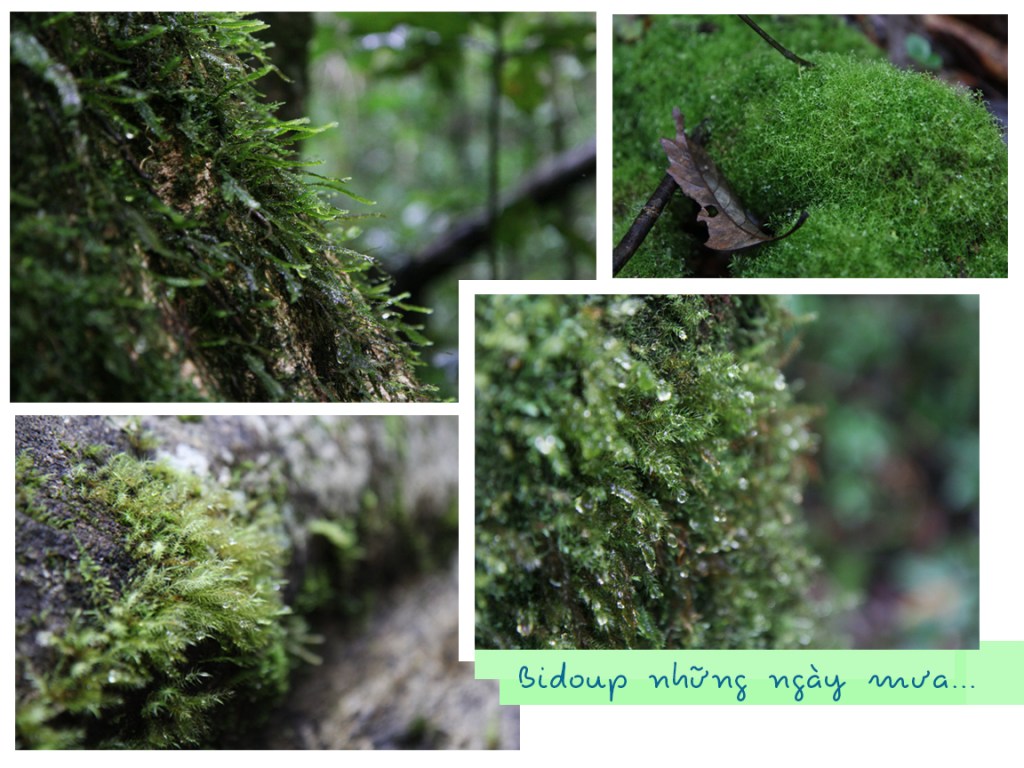 Đặc trưng đoạn Bidoup là rừng nguyên sinh nên cảnh vật nơi đây được phủ xanh toàn bộ, từng cành cây cọng cỏ, từng chiếc lá, bông hoa đều cố tô vẽ cho mình một màu xanh duy nhất: chiếc lá mạ lấp lánh trong cái nắng nhẹ len lỏi qua nhành cây, đám rêu xúng xính chọn màu xanh mướt bên những giọt sương, bụi cỏ nhỏ e thẹn chọn cho mình màu xanh non dịu nhẹ, những cây cổ thụ sững sững kool ngầu trong chiếc áo thẳm xanh,… còn bọn nấm được dịp hí hửng vì có trọng trách tô điểm thêm cho rừng bởi những màu sắc khác…
