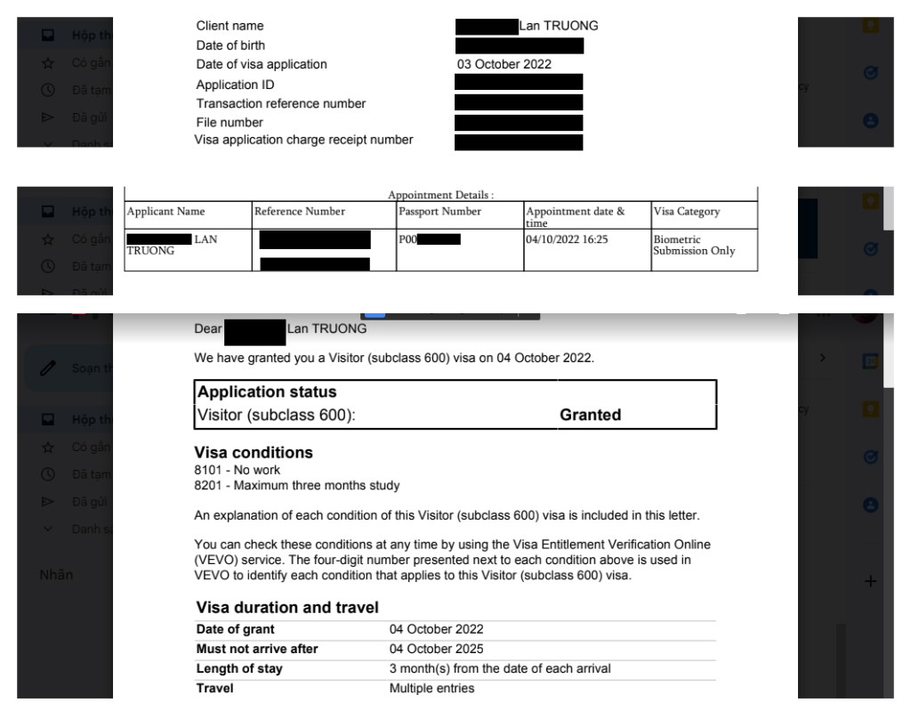 – 3/10 mình submit hồ sơ xong, tầm 5p có mail báo đi lấy dấu vân tay. Nộp ngay 152.1 AUD (gồm phí + phụ phí)