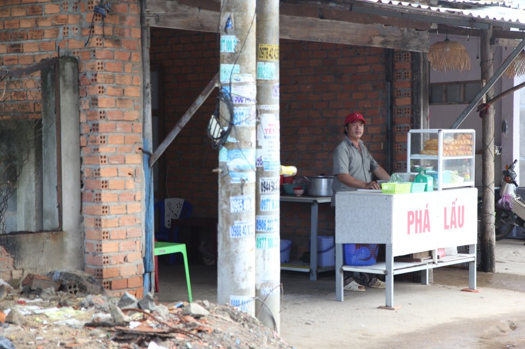 Anh chủ quán mặt ngầu người miền Trung mà cái giọng miền Tây gọi vợ “Em ơi” ngọt như mía lùi. Một tay ảnh lo hết cái quán á, từ khâu nấu đến khâu bán, chị vợ thì ngồi trong nhà, khách đông thì ra phụ hoy.